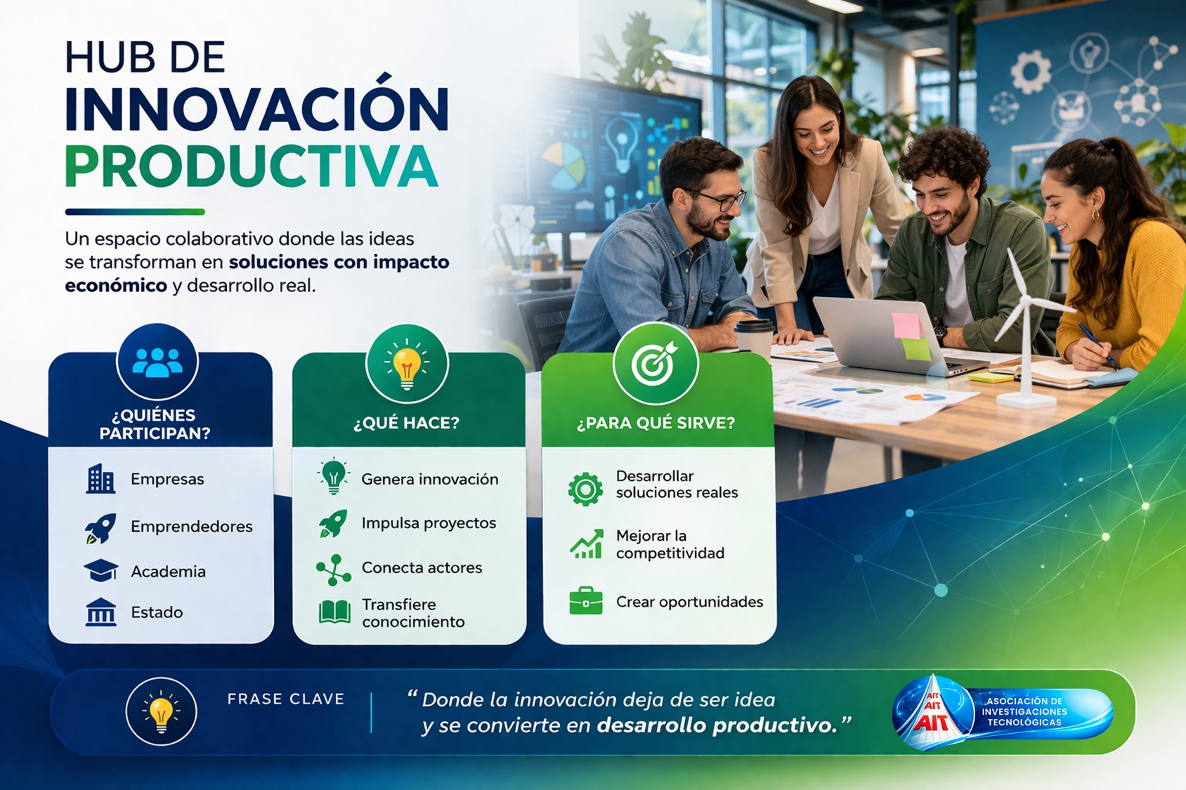 Un Hub de Innovación es un espacio organizacional (físico, virtual o híbrido) que vincula diferentes Ecosistemas conformados por actores del ámbito académico, empresarial público o privado, financiero y social, con el objetivo de promover procesos colaborativos de innovación productiva, desarrollo de proyectos, transferencia de conocimientos y generación de impacto económico, social y tecnológico.